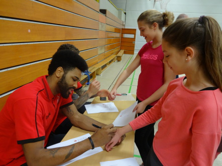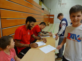 Anschließend konnten Fotos mit den Stars geschossen werden und es wurden Autogramme geschrieben. Zum Abschluss verteilten die Giants großzügig Freikarten an Kids und Eltern für das Bundesligaspiel am Folgetag gegen die Dragons aus Rhöndorf. Und so manch eine konnte so seine „neuen“ Stars am nächsten Tage in voller Aktion bewundern.