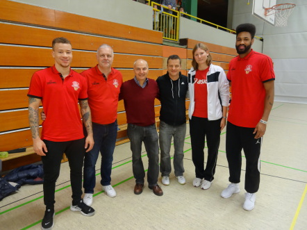 Das Heisenberg-Gymnasium gehörte schon zu den Gründungsmitgliedern der Giants League vor nunmehr 14 Jahren und ist nach mehrjähriger Pause seit 3 Spielzeiten wieder dabei. Volker Schütz, der AG-Leiter, und Heinz Schäfer als Organisator der Giants League begrüßten gegen 10 Uhr die Gäste, die Zuschauer und gut 30 Kids. Schnell entwickelte sich an den Übungsstationen zum Dribbeln, Werfen und Korbleger spaßvolles und intensives Training mit den Profis. Der Höhepunkt war dann aber sicherlich das Spiel gegen die Stars. In schier unaufhörlicher Folge rollten die 5er Teams auf die Profis zu und versuchten diese in Überzahl zu überlisten. Es kam hier zu tollen Szenen mit viel Applaus. Nicht nur die Kids, auch Damon und Kerry hatten sichtlich ihren Spaß.